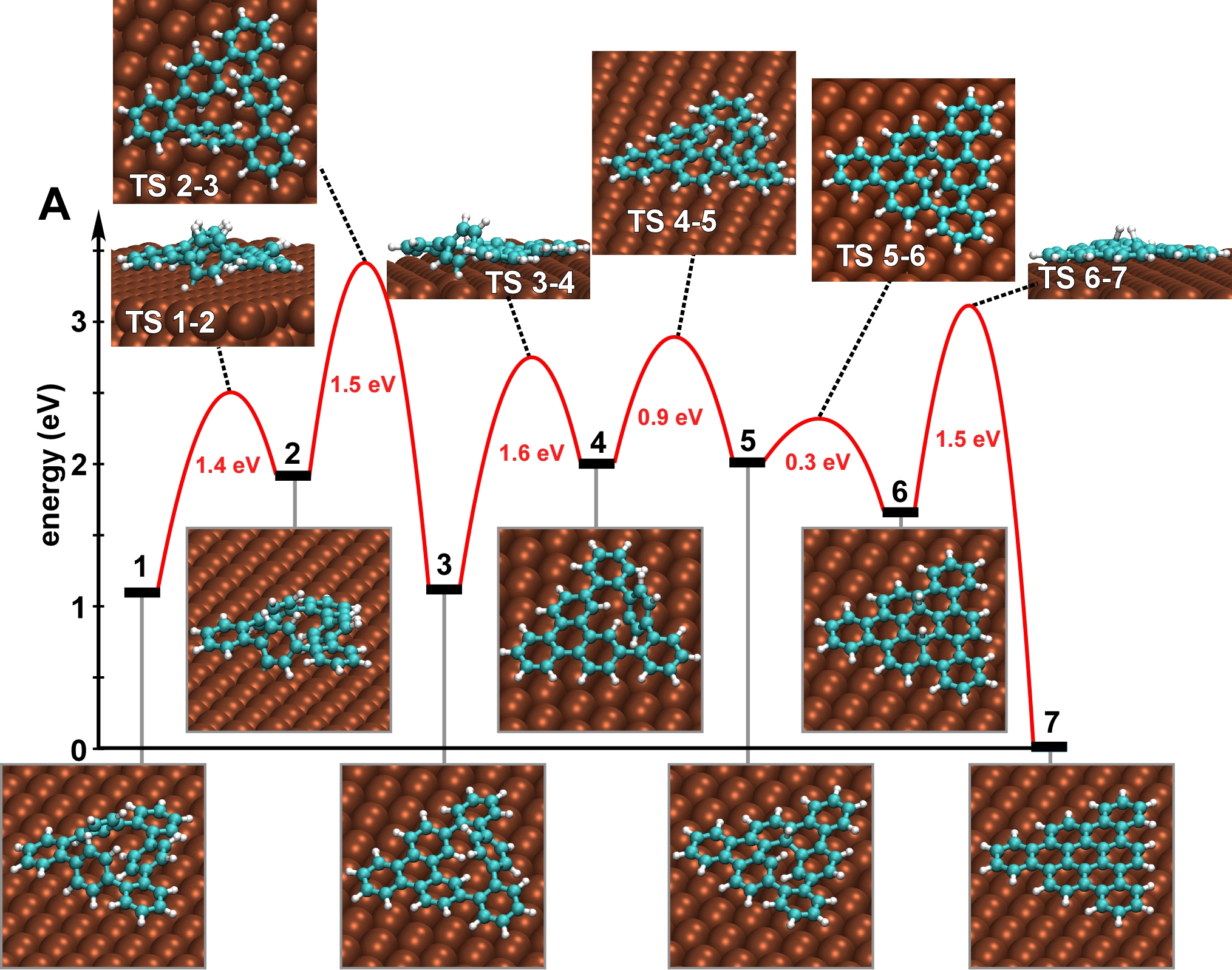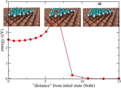 Problem: compute activation barrier for the last step (6 to 7) of the cyclodehydrogenation reaction CHP@Cu(111) → TBC