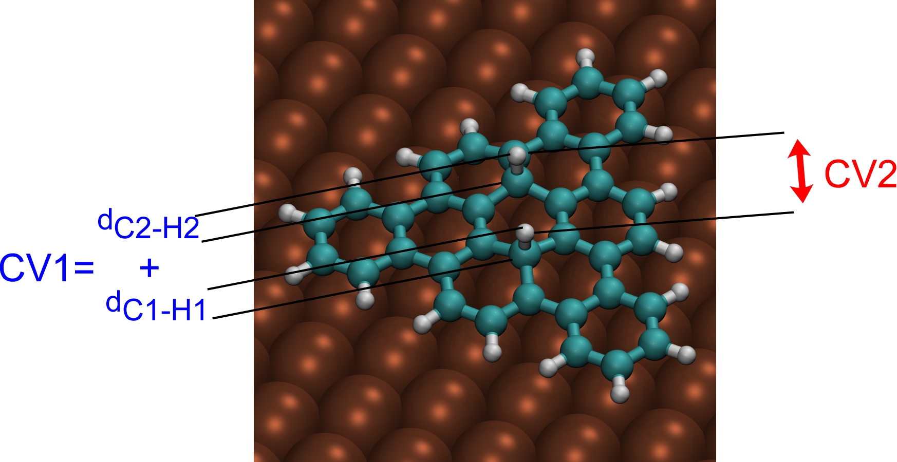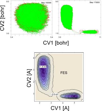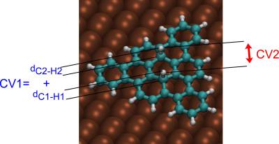 We perform a metadynamics simulation with two collective variables: the sum of C-H distances (CV1) and the H-H distance (CV2). Walls have to be introduced to limit the range of variability of the two CVs.