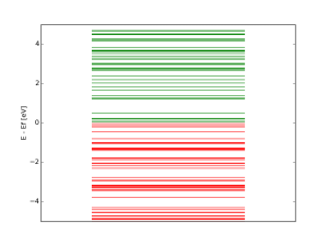 To plot the energy level diagram, copy and paste following lines into the python script eldplot.py. The file energy.dat contains energy eigenvalues in a column from the output file at the previous step. The Fermi energy (Ef) must be entered in the eldplot.py script. Use command python eldplot.py to get the energy level diagram as a png image. Identify the occupied and unoccupied energy levels and name them.