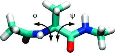 Alanine dipeptide is often studied in theoretical work because it is among the simplest systems to exhibit some of the important features common to biomolecules. It has more than one long-lived conformational state. The relevant angles are the dihedral angles of the backbone, commonly called Φ and Ψ (see figure). In the following scheme, light blue atoms are carbons, white ones are hydrogens, red are oxygens, and blue are nitrogens. So the torsional angle Φ is C-N-C-C and Ψ is N-C-C-N along the backbone.