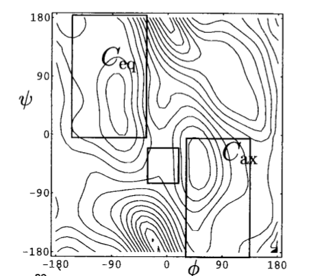 In this exercise you will obtain a simplified version of the above potential energy surface, obtained in a very similar way as in the paper. You will constrain the angles at fixed values using a strong harmonic potential, and optimize all other degrees of freedom. From this, a grid of energies will be built, and the energy diagram (Ramachandran plot) will be constructed.