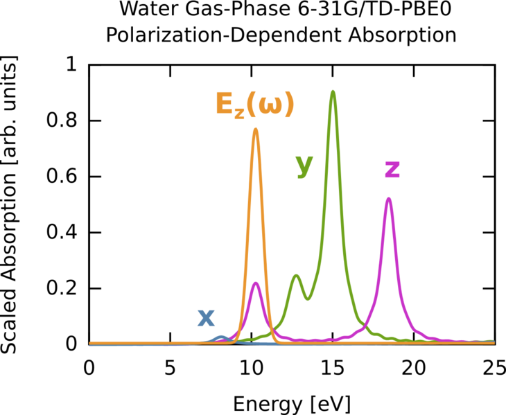 In this second part, we compute the time-dependent electron response to a quasi-monochromatic laser pulse tuned to a particular transition. The spectrum obtained with linear response TDDFT can be also calculated by exciting the system through a laser pulse with a specific polarization along x, y, or z. We will use the results of a calculation described here. The total spectrum (6-31G * */PBE0 gas-phase water) is the same as the one we calculated before. First, we consider the absorption spectrum (computed previously) but plotted for the three polarizations (x,y,z) rather then as a sum. The details are given in the previously cited link.