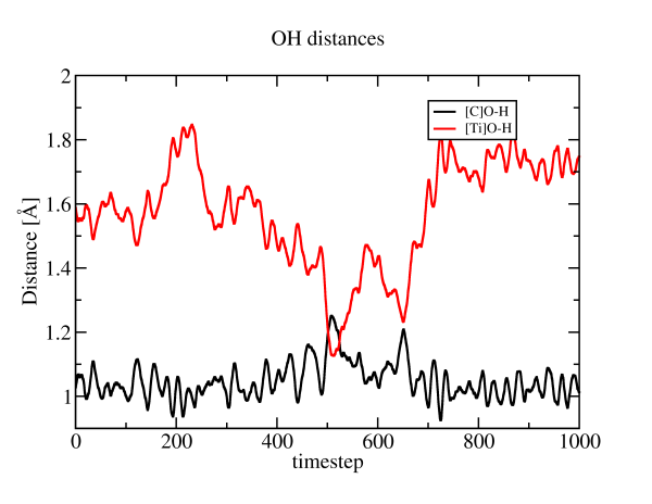 Perform a short ab initio molecular dynamics simulation of the system (~1000 steps, ~0.5ps) by changing to RUN_TYPE MD. After a couple of hours the job should be finished. Now analyze the OH distance in VMD. A possible outcome is :
