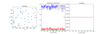 In the central panel average values for the number of isolated molecules, the number of dimers and the number of clusters is plotted. On the right panel the average energy of the system is plotted. Intermediate average values are also written in a output file data_de_T.out where de and T are the input values of the dimer energy and of the Temperature also a final snapshot of the graphic panels is saved as png image