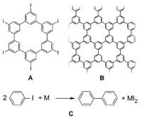 The molecule shown in the image (hexaiodo-substituted macrocycle cyclohexa-m-phenylene (CHP) ), when deposited on a noble metal substrate such as Cu(111) , Ag(111) or Au(111), at room temperature looses the I atoms and starts diffusing.