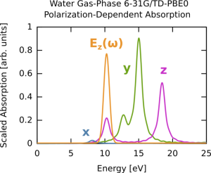In this second part, we compute the time-dependent electron response to a quasi-monochromatic laser pulse tuned to a particular transition. The spectrum obtained with linear response TDDFT can be also calculated by exciting the system through a laser pulse with a specific polarization along x, y, or z. We will use the results of a calculation described here. The total spectrum (6-31G * */PBE0 gas-phase water) is the same as the one we calculated before. First, we consider the absorption spectrum (computed previously) but plotted for the three polarizations (x,y,z) rather then as a sum. The details are given in the previously cited link.