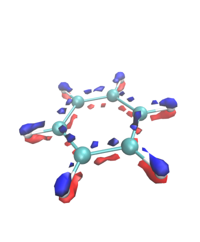 At the optimized (or the most optimized) geometry of benzene monomer perform a Hartree-Fock calculation to compare electron densities. Visualize them with VMD. Electron density difference between MP2 and HF looks as follows: