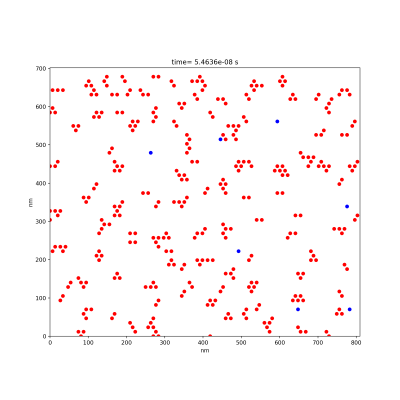 Molecules free to diffuse will be represented via blue dots. Molecules that “irreversibly” formed a bond with a neighboring molecule will be represented by red dots. A few snapshots of the system during time evloution are saved as images.