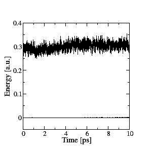 Stable Born-Oppenheimer molecular dynamics can be performed efficiently, and a good conservation of the constant of motion is obtained. This is shown on the left for a 10ps NVE simulation of a sample of 64 water molecules at room temperature. The upper line is the ionic kinetic energy and the lower line is the constant of motion (total energy).