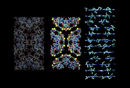 Shown on the left is a representation of the lowest unoccupied molecular orbital (LUMO) of a sample 256 water molecules (see also our picture gallery).