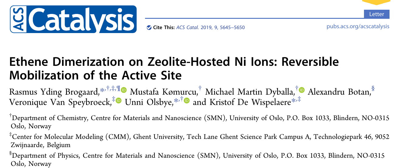 Rasmus Yding Brogaard, Mustafa Kømurcu, Michael Martin Dyballa, Alexandru Botan, Veronique Van Speybroeck, Unni Olsbye & Kristof De Wispelaere; 2019; Ethene Dimerization on Zeolite-Hosted Ni Ions: Reversible Mobilization of the Active Site ACS Catalysis 9, 5645–5650 (2019)