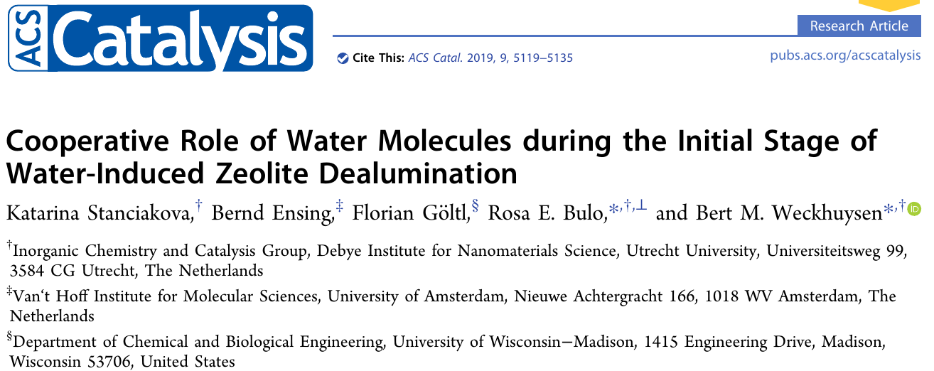 Katarina Stanciakova, Bernd Ensing, Florian Göltl, Rosa E. Bulo & Bert Weckhuysen; 2019; Cooperative Role of Water Molecules during the Initial Stage of Water-Induced Zeolite Dealumination ACS Catalysis 9, 5119–5135 (2019)