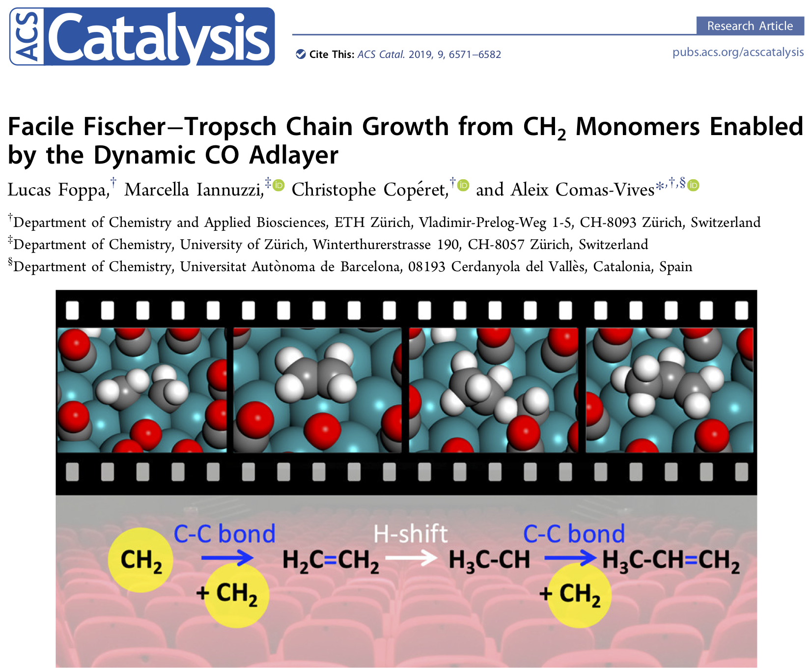 Lucas Foppa, Marcella Iannuzzi, Christophe Copéret & Aleix Comas-Vives; 2019; Facile Fischer–Tropsch Chain Growth from CH2 Monomers Enabled by the Dynamic CO Adlayer ACS Catalysis 9, 6571-6582 (2019)