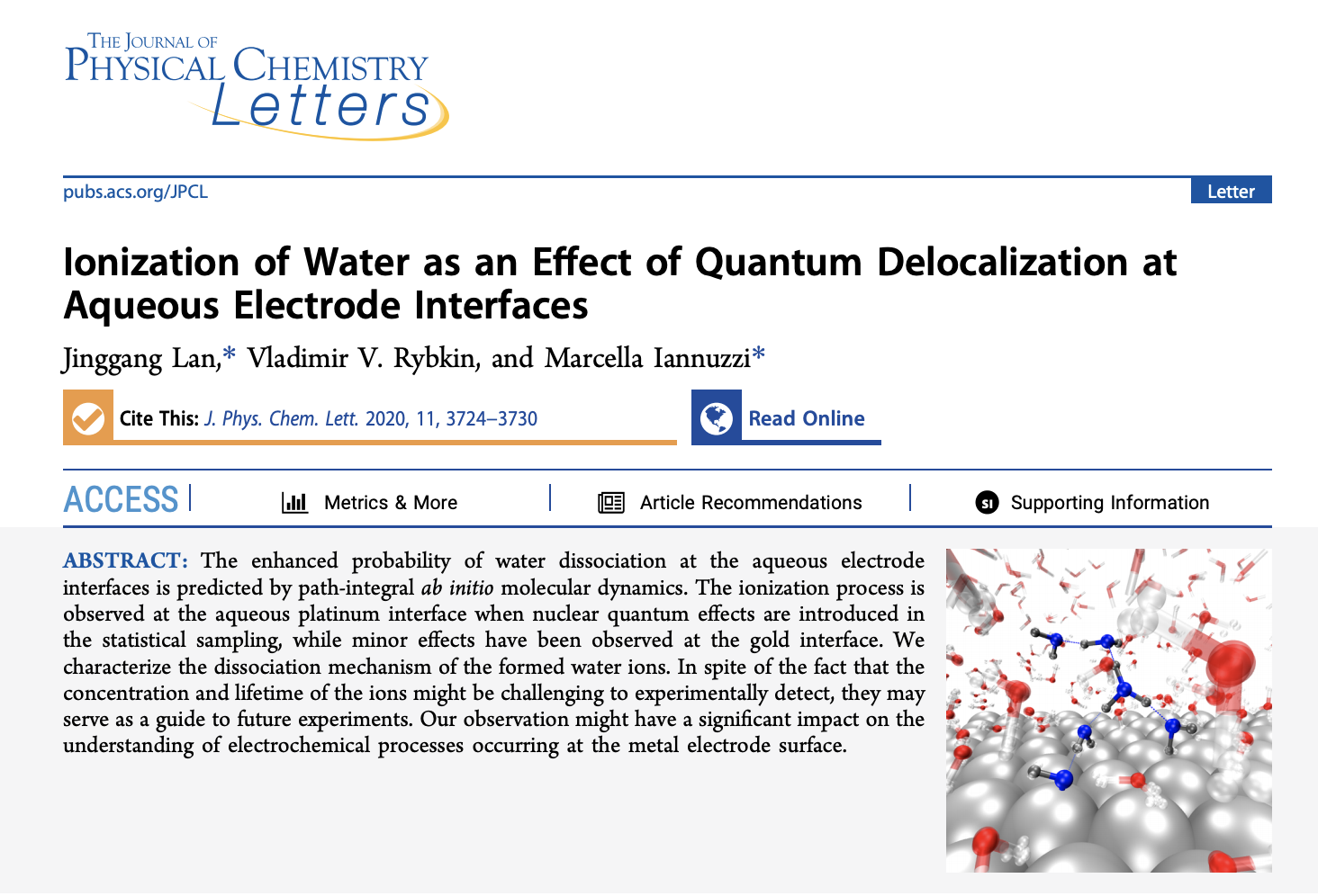 Jinggang Lan, Vladimir V. Rybkin, and Marcella Iannuzzi; 2020; Ionization of water as an effect of quantum delocalization at aqueous electrode interfaces. J. Phys. Chem. Lett. 2020, 11, 9, 3724-3730