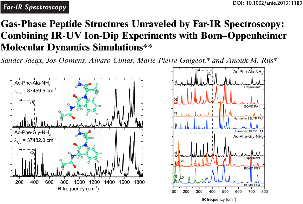 Sander Jaeqx, Prof. Dr. Jos Oomens, Dr. Alvaro Cimas, Prof. Dr. Marie-Pierre Gaigeot, and Dr. Anouk M. Rijs; 2014; Gas-Phase Peptide Structures Unraveled by Far-IR Spectroscopy: Combining IR-UV Ion-Dip Experiments with Born–Oppenheimer Molecular Dynamics Simulations