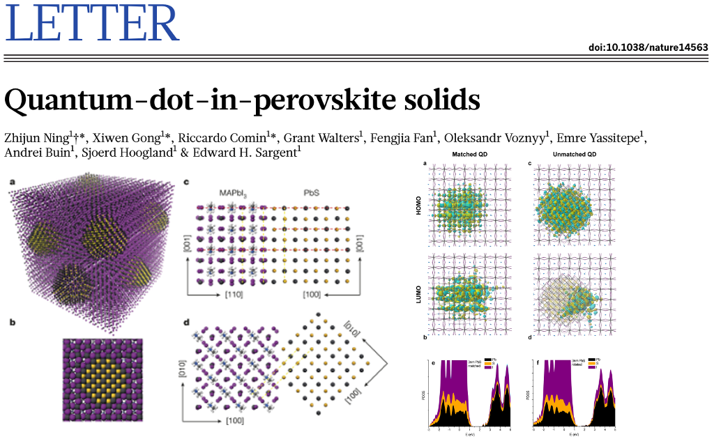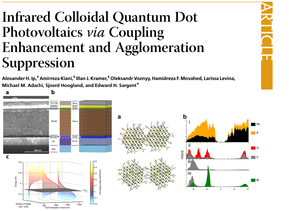 Zhijun Ning, Oleksandr Voznyy, Jun Pan, Sjoerd Hoogland, Valerio Adinolfi, Jixian Xu, Min Li, Ahmad R. Kirmani, Jon-Paul Sun, James Minor, Kyle W. Kemp, Haopeng Dong, Lisa Rollny, André Labelle, Graham Carey, Brandon Sutherland, Ian Hill, Aram Amassian, Huan Liu, Jiang Tang, Osman M. Bakr & Edward H. Sargent; 2014; Air-stable n-type colloidal quantum dot solids