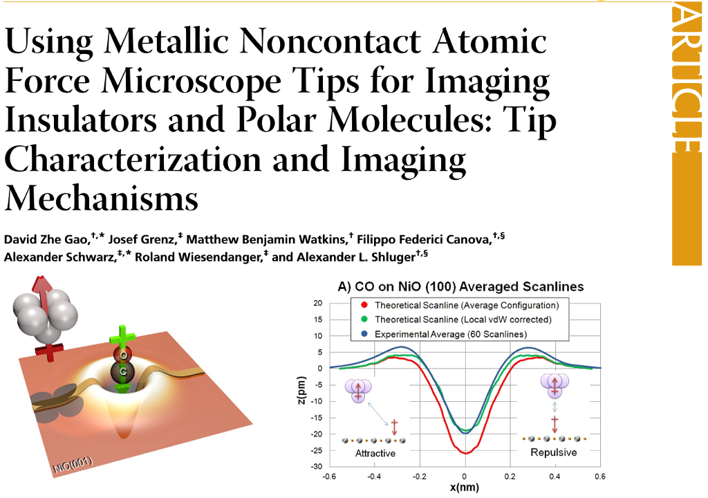 David Zhe Gao, Josef Grenz, Matthew Benjamin Watkins, Filippo Federici Canova, Alexander Schwarz, Roland Wiesendanger, and Alexander L. Shluger; 2014; Using Metallic Noncontact Atomic Force Microscope Tips for Imaging Insulators and Polar Molecules: Tip Characterization and Imaging Mechanisms