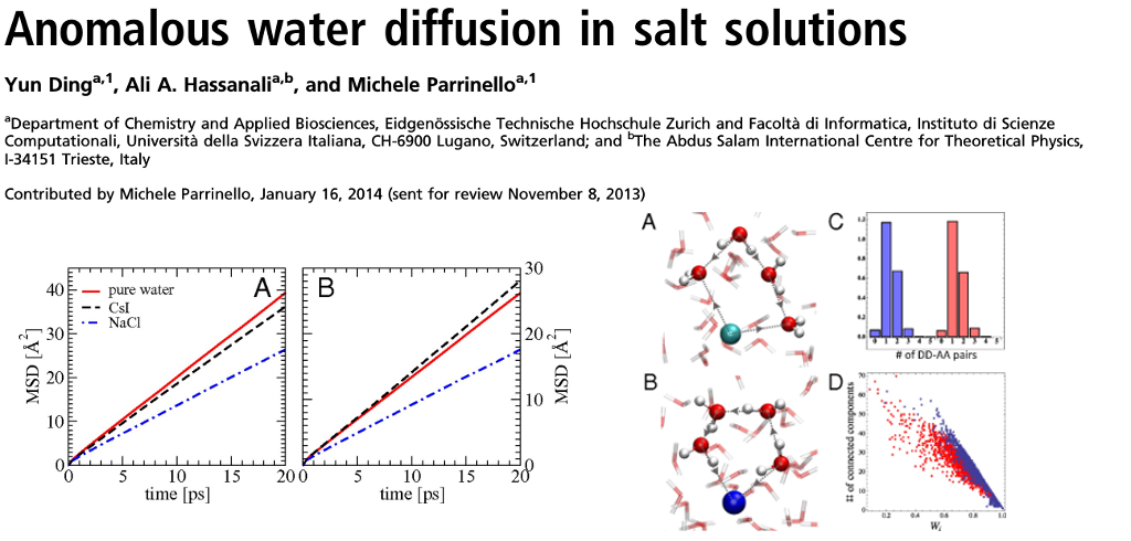 Yun Ding, Ali A. Hassanal, and Michele Parrinello; 2014; Anomalous water diffusion in salt solutions