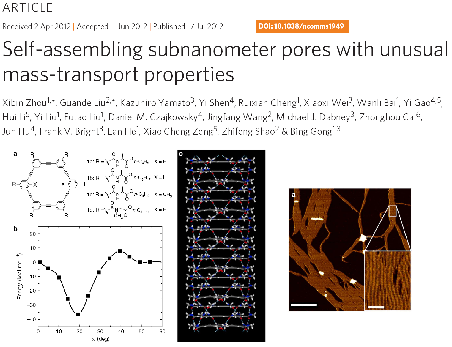 Xibin Zhou, Guande Liu,Kazuhiro Yamato, Yi Shen, Ruixian Cheng, Xiaoxi Wei, Wanli Bai, Yi Gao, Hui Li, Yi Liu, Futao Liu, Daniel M. Czajkowsky, Jingfang Wang, Michael J. Dabney, Zhonghou Cai, Jun Hu, Frank V. Bright, Lan He, Xiao Cheng Zeng, Zhifeng Shao & Bing Gong; 2012; Self-assembling subnanometer pores with unusual mass-transport properties