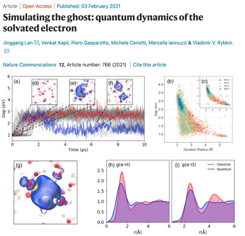 Jinggang Lan, Venkat Kapil, Piero Gasparotto, Michele Ceriotti, Marcella Iannuzzi, and Vladimir V. Rybkin; 2021; Simulating the ghost: quantum dynamics of the solvated electron. Nature Comm. 2021, 12, 766